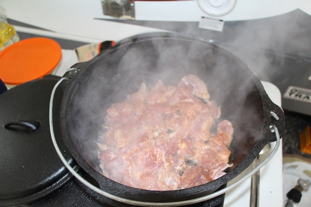 Cut up vegetables and set aside. Cut chicken thighs into 1″ x 1″ pieces and season well. Heat cast iron pot on medium to high and add oil. Place seasoned chicken thighs into pot and push down so that the chicken thighs are flat against the bottom of the pot. This will ensure you get a good browning of the chicken. When chicken is browning, don’t stir.