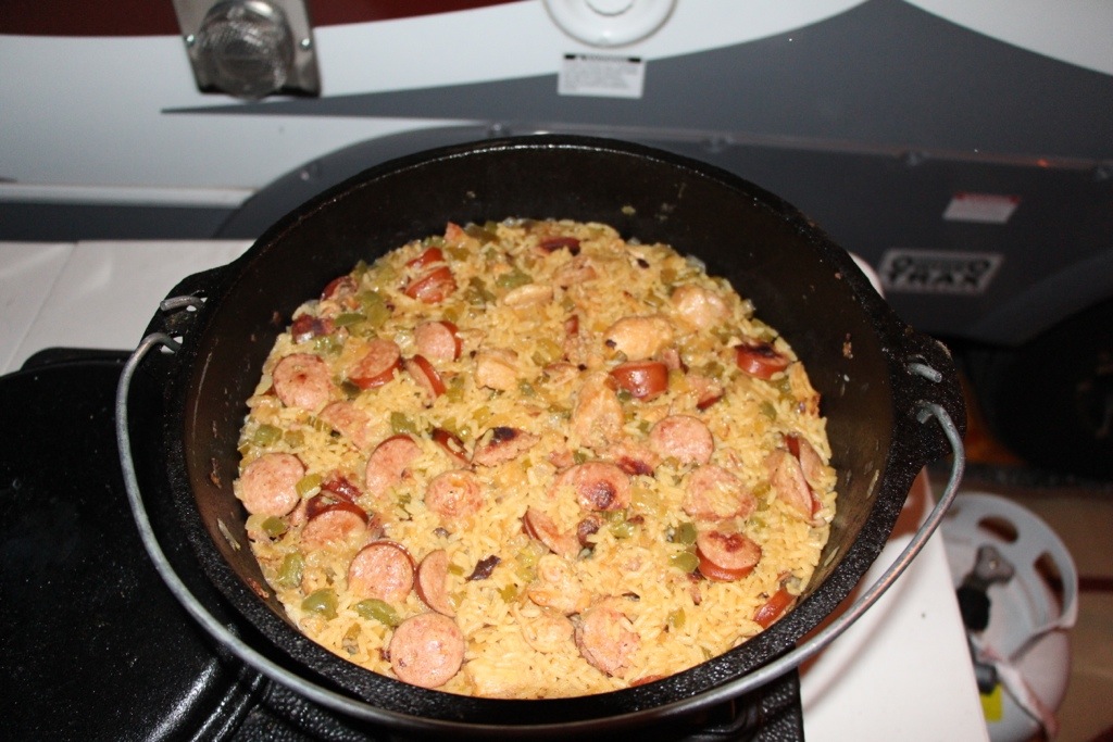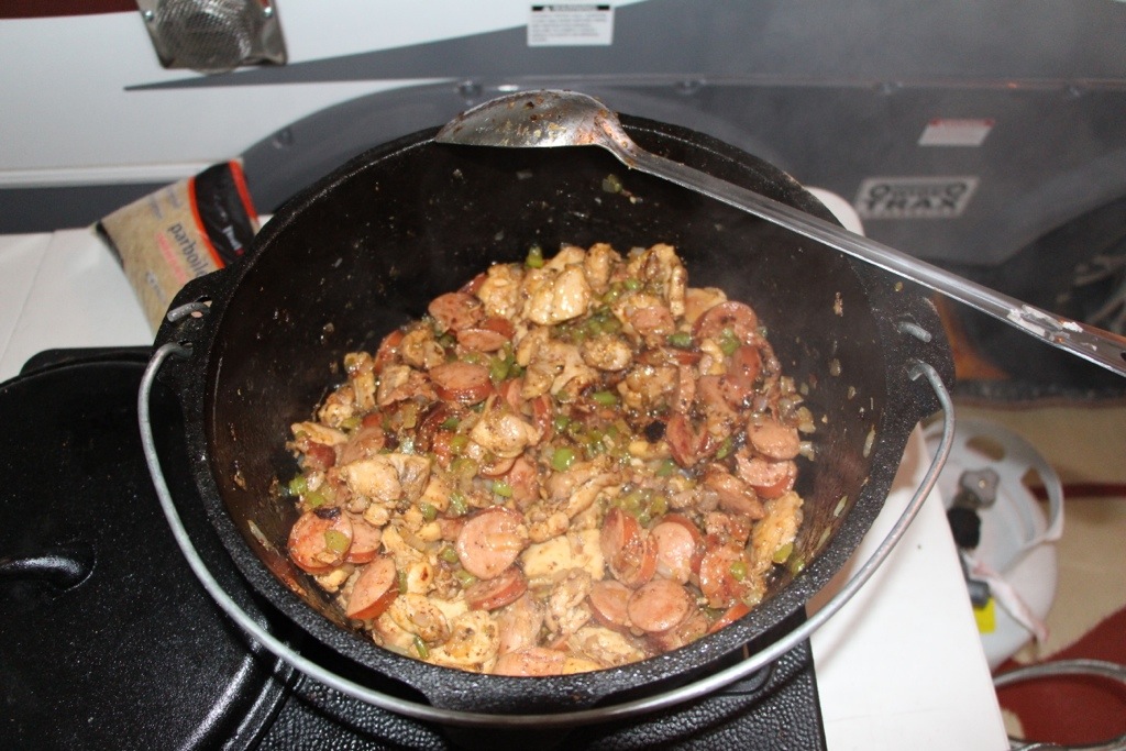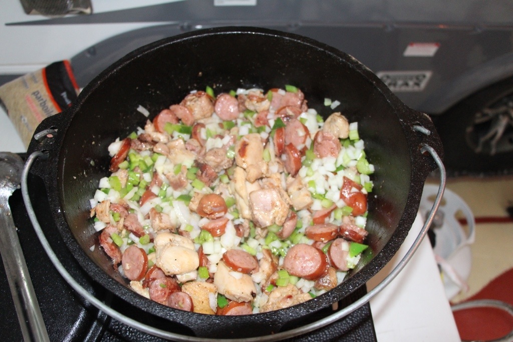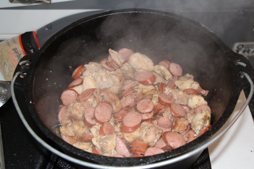 Alright, here’s my quick and easy Chicken and Sausage Jambalaya Recipe. I most often cook this during camping trips because it doesn’t take much cooking time as a typical pork Jambalaya often does. Gotta cook it in a well-seasoned cast iron pot, we love it..