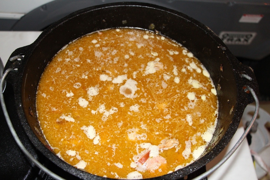 Add the 4 cups of parboiled rice. I like using parboiled because it’s more forgiving than regular rice. You can be off a bit on the chicken broth and the rice will still turn out perfect, my little secret. Nobody likes crunchy rice, right?! Now look on the back of the bag of rice, substitue the amount of water you would use to cook the rice with Chicken broth. Again, it doesn’t have to be perfect, we’re using parboiled. Add the broth to the pot. Remember that “gradeau” on the bottom, go ahead and stir it up. You should notice your liquid color get darker and darker, that’s the secret to deep brown jambalaya. After stirring up the bottom, raise the temperature to high and wait for it to boil.