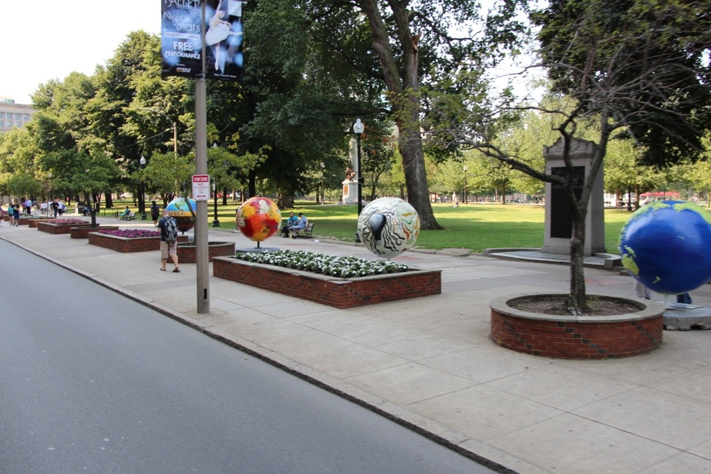 Next stop was Boston Common. This is the largest green space in the city. It was created back in the day as a green space for cattle and other farm animals. Bostonians were complaining about the stench of manure in the air so government officials set aside the 50 acres known as Boston Common. It is common to take a swan ride on the pond but unfortunately we didn’t have enough time. The globes below actually line most of the perimeter side walks, they were an art display for the summertime.