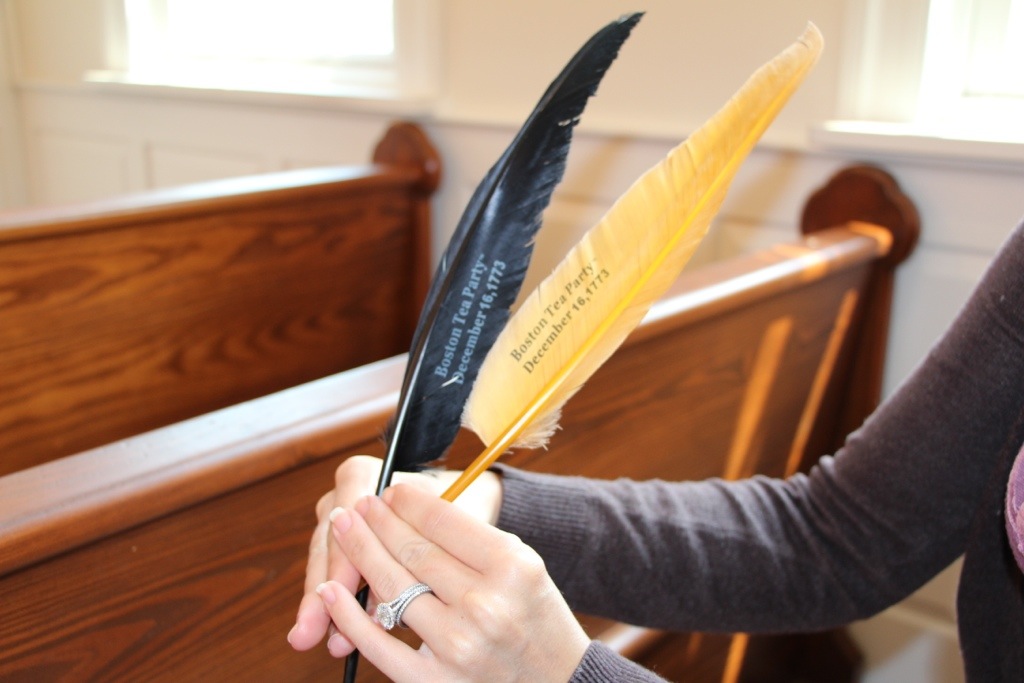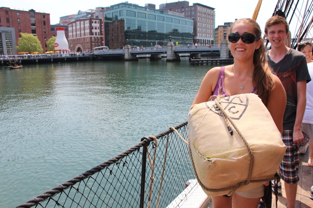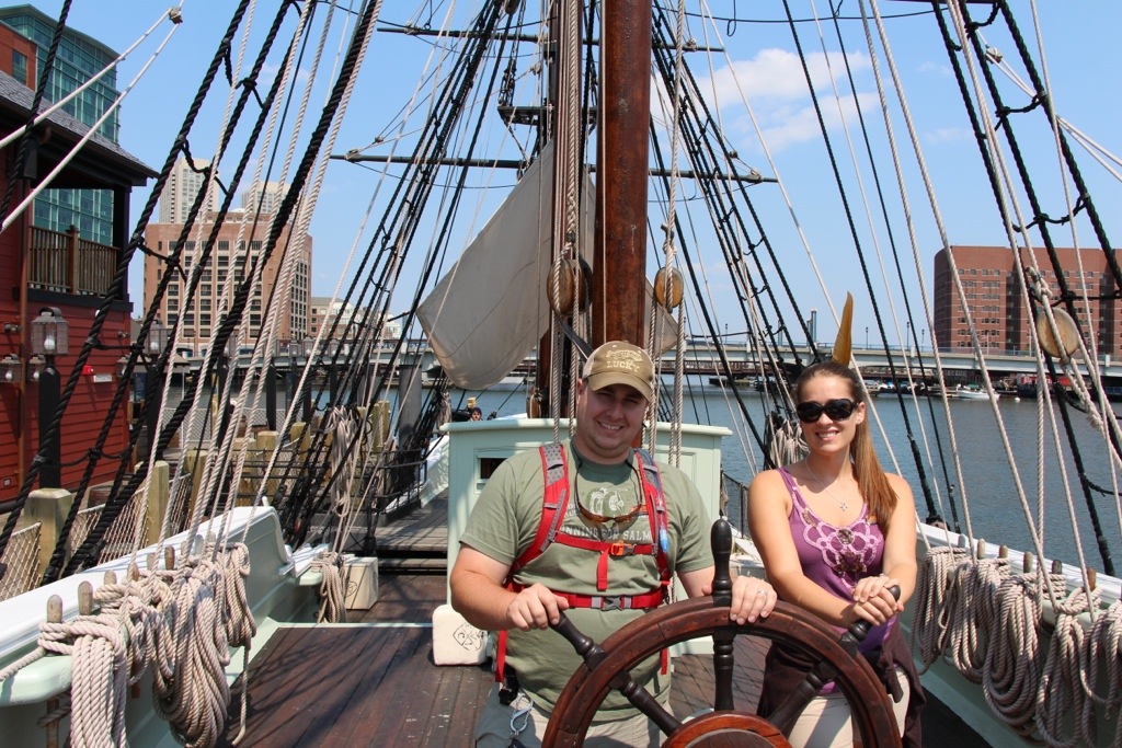 Our next stop was the Boston Tea Party Museum. I wanted to tour the replica ships and museum so we hopped off of the trolley and bought tickets. The tour was great, actual revolutionary characters toured you around the grounds. We were disguised just like the Tea Party Patriots the day with feathers and we actually were able to throw tea crates overboard…Hiizzzaaa! Aimee and I were both given characters that we would play during the tour as well. My character actually died during the Boston Tea Party. He was in the bottom part of the ship tying up the crates of tea to the block and tackle system. A crate of tea came loose and fell on him and he died immediately. Given the fact that a treasonous act was ongoing, the patriots hid him in a carpenter’s shop under a pile of saw dust, an ideal burial of a former carpenter! Aimee’s character actually stole a bit of the tea and stored it in his boot. He passed it on down to his future generations to remember this patriotic moment. First we toured the ship, the Eleanor. It was a replica built to scale of a merchant ship. My first thought was how could you sail the oceans in this small vessel…